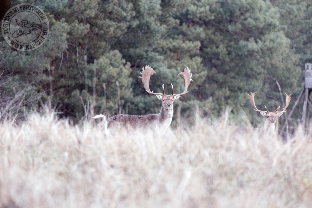 [gallery link="file" ids="276,277,278"]While they were stalking in the afternoon I spent the time with the Jäger rifle on a shooting stand located on the top of a small hill. Just at the foot of the hill went the trail that the fallow deer generally use to go out for the cultivated lands to feed in the night. A good position to wait for the right game to appear. The shot was quite challenging as the possible distance was between 70-100 meters, while I had to shoot cca 40 degrees downward. Don’t forget: whenever you shoot downhill or uphill always aim a bit lower to compensate the deformation of the trajectory. I ended the day with taking an old fallow deer doe that I watched for nearly 2 hours walking solely along the mentioned trail very-very slowly, with watching and listening to all directions. The shot went off from 85 meters. The REAL bullet penetrated right through the lungs. The game walked 10-15 meters back the wood and collapsed.