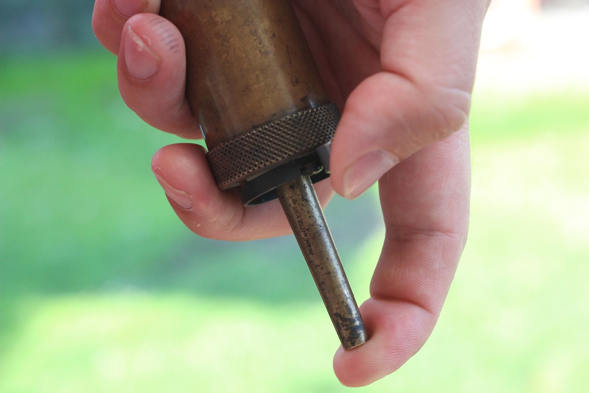 An old powder laddle: good and fast way to fill the vials, but be careful how many times you tap the measure.[/caption]