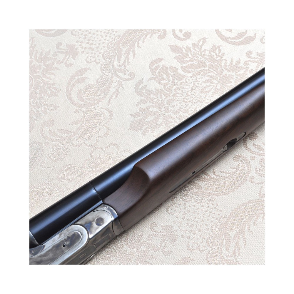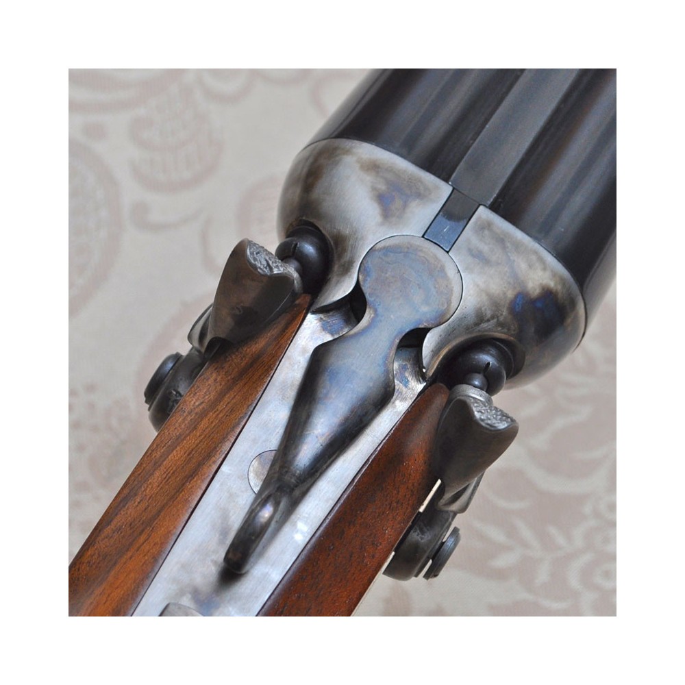 The Wyatt Earp side by side shotgun can be easily opened with only one hand allowing very fast loading of the shells. The extraction of the shells is quick and the cocking of the hammers is easy. The walnut pistol grip stock is checkered. The case hardened frame has the writing Wyatt Earp (on request without the writing). 3" (76 mm) Magnum chambers, the chromed barrel bores are blue finished; the sturdy hammers, featuring Colt's style, can be cocked together in a simple and safe manner.